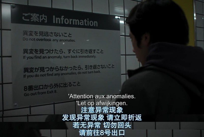 男主被困于一个地铁站的地下道里,头顶的标识牌写着前方是8号出口。